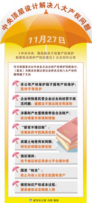 《中共中央 国务院关于完善产权保护制度依法保护产权的意见》27日正式对外公布。作为我国首次以中央名义出台的产权保护顶层设计,意见为解决长期以来社会所关注的八大产权问题明确了方向。