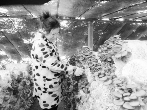 昨日,在沈丘县周营乡黄孟营村食用菌栽培基地,菇农王秀华正查看平菇生长情况。 今年该乡在发展特色农业中,根据消费群体需求订制种植生态绿色平菇,,并通过微信、视频让消费者全程跟踪监督,买到安全放心的平菇。谢辛凌 摄