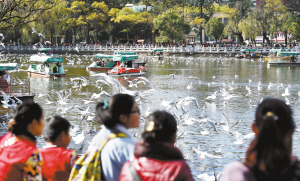 12月18日,市民和游客在昆明市的翠湖公园观赏红嘴鸥。当日,昆明阳光明媚,气候宜人,当地市民与外地游客纷纷来到翠湖公园、大观公园和滇池大坝等地,与前来越冬的红嘴鸥近距离接触。
