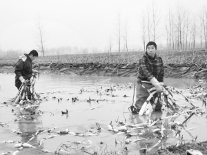 昨日,沈丘县周营乡苏楼村藕农孙进堂父子正在一个几十亩大的池塘里收获莲藕。时下正值莲藕收获季节,该县周营、白集、北城等乡镇都种植有莲藕,一般亩产均在5000公斤左右。