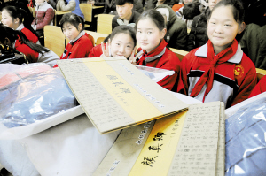 近日,太康县马头镇一中的几位同学收到了一份意外的礼物后,高兴地笑了。当天,中国信息报社和农民日报社共同组织的“送温暖、献爱心、进基层捐赠仪式”在太康县马头镇政府举行,河南本洋光电、温州铭丰科技参与活动并为学生捐赠了爱心羽绒服、节能灯和毛笔书法练习工具。刘俊涛 摄