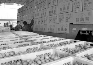 昨日,西华县二磊蛋鸡养殖专业合作社的员工正在整理鸡蛋,准备外运。该合作社成立于2012年10月,采取“农户建合作社、农民做股东”的现代养殖模式运行。经过几年发展,现有社员800多户,存栏蛋鸡400多万只。他们注册的“益君康”牌鸡蛋全部销往上海、广东、安徽、南京等地,旺季每天可发出60多吨鲜鸡蛋。记者 沈湛 摄