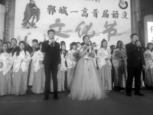 本报讯 (记者 朱鸿 通讯员 王雪涛 丁慧芳)元旦前夕,郸城一高以学生发展为本,结合语文学科人文性、工具性、审美性等特点,首次举办了语文文化节(右图)。本届语文文化节突出“趣味性”“知识性”“可操作性”,给学生带来了耳目一新的感觉,激发了学生学习的兴趣。