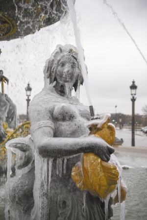 法国气象局在巴黎及其近郊发布冰雪橙色预警,巴黎气温骤降。这是1 月2 日在法国巴黎协和广场拍摄的“海之喷泉”里的被冰包裹的人鱼雕塑。 新华社发