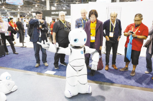 中国创新产品亮相拉斯维加斯消费电子展 1月6日,在美国拉斯维加斯消费电子展上,参观者在一家中国企业的展位上观看一个接受语音指令进行各种舞蹈动作的机器人。此次拉斯维加斯消费电子展充满了中国元素,3800多家参展商中,超过三分之一来自中国。新华社发