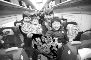 1月13日,在从汉口到成都东的D2259次列车上,小朋友展示乘务员赠送的“福”字和糖果。
