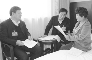 昨日上午,出席省十二届人大七次会议的我市代表在会议召开之前商议议案。记者 王映 摄