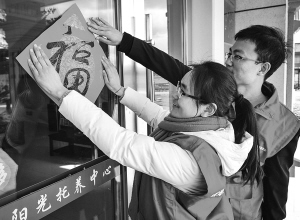 浙江慈溪:爱心志愿者“迎新春”走进敬老院 1月16日,钱海军志愿服务中心的志愿者们在托养中心贴“福”字。当日,浙江省慈溪市钱海军志愿服务中心的50多名志愿者们来到慈溪市掌起镇阳光托养中心,开展“暖迎新春,情牵夕阳”主题活动。新华社发