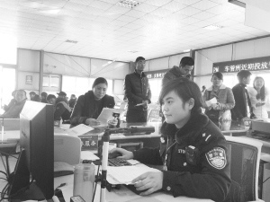 1月13日,中原二手车交易市场机动车登记服务站工作人员正在认真办理车辆入户手续。