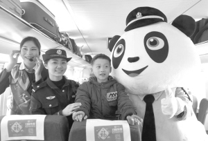 “安全课堂”走进“西子号”高铁 1月17日,一名参加“安全课堂”的小朋友答对问题后与吉祥物“熊猫护护”及工作人员合影。当日,在杭州开往北京的G20次“西子号”高铁列车上,上海铁路局杭州客运段与杭州乘警支队联手开展“安全课堂进车厢”活动。新华社发