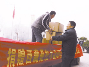 1月10日上午,西华县“大富城”项目向西藏聂拉木县琐作乡中心小学捐赠400套防寒服,让那里的孩子们温暖过冬。图为工作人员正在将爱心物资搬运装车。晚报记者 金月全 摄