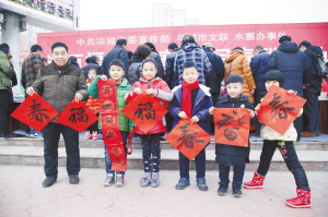 为丰富群众节日期间的精神文化生活,昨日,项城市组织30多名书法家在市标广场泼墨挥毫,给过往群众义务书写春联。张永久 摄