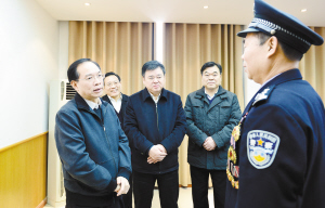 许甘露、徐光一行首先看望了市中级人民法院民四庭副庭长李俊华、市公安局治安和出入境管理支队五大队教导员李春伟、沈丘县人民检察院党组成员欧阳永强、西华县司法局聂堆司法所所长兼人民调解委员会主任耿玉贤等四位英模代表,向他们致以崇高的敬意和亲切的慰问,并与他们亲切座谈。许甘露说:“政法工作是党和政府的一项重要工作。在这条战线上工作的同志们吃苦耐劳、履职尽责,付出了很多心血和汗水,甚至是健康和生命。每年政法战线都有一批先进模范人物涌现,也有一批同志献出了宝贵生命,更多的同志则是默默无闻地奋战在基层一线,为河南的经济发展、社会治安、百姓安宁作着贡献。你们四位都是政法战线上的杰出代表,是政法战线涌现的雷锋式模范人物,你们的事迹感人肺腑,你们身上表现出的为民爱民可贵品质和吃大苦、耐大劳精神值得大家学习和称赞。在新春佳节即将到来之际,我们代表省委、省政府向你们致以新春的祝福,并向你们的家人表示问候,祝愿你们工作顺利、身体健康、万事如意、阖家欢乐!”