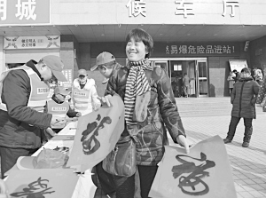 响应市文明办开展“暖暖过新年,志愿在身边”活动的号召,近日,市公路局组织本单位志愿者在周口客运汽车总站开展了“环境益民”活动,志愿者们清理场地垃圾,劝导过往乘客不购买不然放烟花爆竹,书法家志愿者特意准备了纸、墨、笔、砚等工具,为返乡农民工送“福”写春联,赢得了过往群众的欢迎。一位刚下车的打工者手拿春联高兴地说:“一到家就能感受到家乡人的热情,这活动太好了,惠民、温暖,家乡真好!”杨春黎 摄