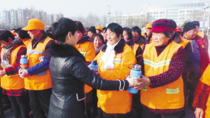 1月22日下午,爱心人士韩平向环卫工人捐赠保温杯仪式举行,共捐赠出200多个保温杯,总价值3万余元。 理效明 刘静 摄