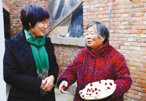 春节前夕,在花园办事处后高营村,项城市委常委、宣传部长张敏(左)将花馍送到贫困户家中,为困难群众送去新春的祝福。 王洁石 摄