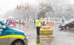 1月31日,全市普降小到中雪,交警部门采取应对措施,保障行车安全。图为项城市交警在中心广场路口冒雪指挥过街车辆通行。段向阳 王少辉 摄