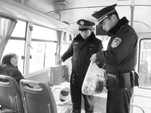 2月4日,商水县公安局练集派出所民警在发往市区的公交车上查验旅客是否携带违禁物品。近日,商水县练集镇打出平安建设组合拳,悬挂宣传横幅100多条,发送手机短信3800多条,发放宣传材料4600多份,并在主要路口安装太阳能红绿灯,成立武装巡逻队,开展全天候巡逻,确保节日期间社会大局持续稳定。