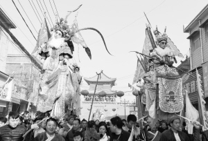 2月12日,河南省浚县民间社火团体在古庙会上表演背阁。当日是农历正月十六。在河南省浚县举行的正月古庙会上,数十支由当地群众组成的社火表演团队轮番表演抬阁、舞狮、踩高跷等社火演出。