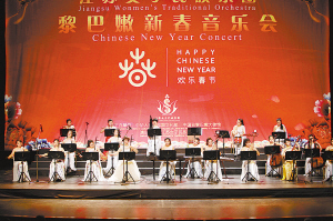 中国江苏女子民族乐团在黎巴嫩演出 2月11日,在黎巴嫩首都贝鲁特以北的朱尼耶,中国江苏女子民族乐团在新春音乐会上演出。当日,江苏女子民族乐团在这里举行新春音乐会首场演出,为当地民众以及在黎巴嫩的华侨华人奉上一场听觉盛宴。