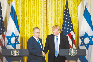 特朗普称实现以巴和平不限于“两国方案” 2月15日,在美国华盛顿白宫,美国总统特朗普(右)与来访的以色列总理内塔尼亚胡在联合记者会上握手。美国总统特朗普当日称,只要以色列和巴勒斯坦双方愿意,他对以“一国方案”还是“两国方案”实现以巴和平均表示支持。新华社发