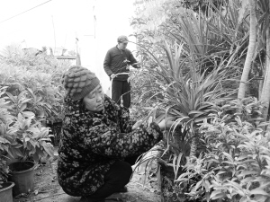 昨日,沈丘县周营乡孔营村的花农孔凡志和老伴在精心管护培育的花卉盆景。 近年来,沈丘县农民针对城乡消费者的需求,把花花草草“请”进温室大棚,进行科学种植,走上了一条脱贫致富路。