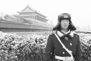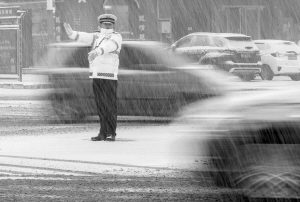 山西运城盐湖区交警大队五中队交警冒雪执勤。