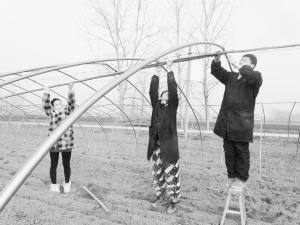 右图:昨日,沈丘县周营乡蔬菜大棚种植户正忙碌着为瓜菜大棚安装骨架。近年来,该县通过“传、帮、带”等方式积极发展蔬菜大棚特色农业种植,按照“企业+农户+合作社”的生产模式,从而增加了菜农们的经济收入。