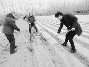上图:近日,商水县黄寨镇勾营村党员干部正在帮助村民为刚种植的娃娃菜覆盖农膜。春节过后,该镇党委组织全镇干部深入春耕一线,帮助群众春耕生产。 乔连军 摄