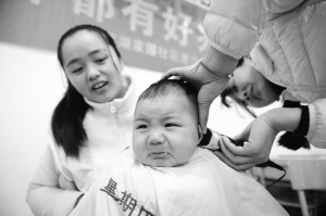 二月二 剃“龙头” 2月27日,在安徽省合肥市滨湖家园社区,志愿者在给一名小朋友免费理发。当日是农历二月初二,民间有“二月二,剃龙头”的传统习俗。新华社发