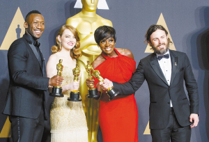 2月26日,在美国洛杉矶好莱坞杜比剧院,(从左至右)最佳男配角奖获得者马赫沙拉·阿里、最佳女主角奖获得者艾玛·斯通、最佳女配角奖获得者维奥拉·戴维斯和最佳男主角奖获得者卡西·阿弗莱克合影。