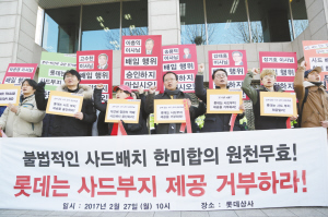 当天,“阻止‘萨德’在韩部署全国行动”等7个韩国市民团体在国防部门前召开记者会并举行反对示威,称部署“萨德”是“韩美间强行推进的违法事项”,主张部署完全无效,并表示星州郡及金泉市民众将向首尔行政法院就国防部的行为提起行政诉讼。