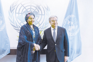联合国常务副秘书长阿明娜·穆罕默德宣誓就职 2月28日,在位于纽约的联合国总部,联合国常务副秘书长阿明娜·穆罕默德(左)在就职仪式上宣誓后与秘书长古特雷斯握手致意。联合国常务副秘书长阿明娜·穆罕默德当日在联合国总部宣誓就职,她承诺将在可持续发展、性别平等、青年问题等各方面支持秘书长工作。新华社发