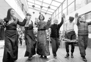 同乐一家亲 3月1日,在合肥市金玫瑰居家养老中心,合肥市第三十五中学西藏班的学生和社区老年居民一起跳藏族舞蹈。当日是藏历新年正月初三,安徽省合肥市第三十五中学西藏班的学生来到该市包河区芜湖路街道金玫瑰居家养老中心,和这里的社区老人们一起联欢,展示藏历新年文化。新华社发