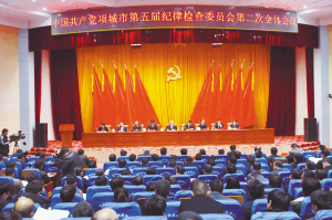本报讯 2月22日,中国共产党项城市第五届纪律检查委员会第二次全体会议在市党政综合楼二楼会议中心召开(如右图)。市委书记刘昌宇出席会议并讲话,强调要深入贯彻落实党的十八届六中全会、中央纪委十八届七次全会、省纪委十届二次全会和周口市纪委四届二次全会精神,推进全面从严治党向纵深发展,为决胜全面建成小康社会、实现我市经济社会持续健康发展提供保证。