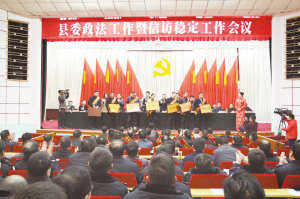 会上,县委副书记、政法委书记程维峥作政法信访工作报告,对下一步工作进行安排部署;县委常委陈秉生宣读了《县委、县政府关于对2016年度平安建设先进单位及见义勇为先进分子和信访工作先进单位的表彰决定》;与会领导为先进集体和个人进行了颁奖;各乡镇、办事处主要负责同志向县委书记林鸿嘉递交了《2017年度综治和平安建设工作目标责任书》和《2017年度党委政府信访工作目标责任书》。