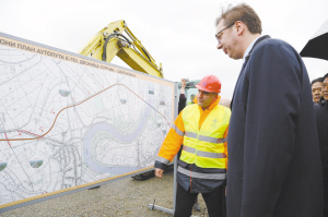 中企承建的塞尔维亚E763高速公路苏尔钦-奥布雷诺瓦茨段开工 3月1日,在塞尔维亚奥布雷诺瓦茨,工作人员为塞尔维亚总理武契奇(前)讲解E763高速公路路线图。中资企业承建的塞尔维亚E763高速公路苏尔钦-奥布雷诺瓦茨段1日举行开工仪式,标志着该项目进入施工阶段。新华社发