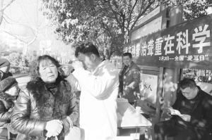 3月2日,商水县中医院的耳科医生正为群众进行义诊。为迎接第18个全国“爱耳日”的到来,商水县中医院组织耳科医生深入街道、社区开展义诊活动,为广大市民免费提供耳部健康检查,讲解爱耳护耳知识。 刘飞 魏红 摄