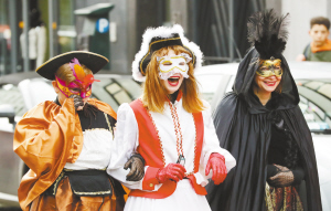 3月4日,在比利时首都布鲁塞尔,人们参加面具狂欢节。一场面具狂欢节4日在这里上演。这场狂欢节仿照威尼斯狂欢节的风格,表演者们身着华丽的服装,头戴各式面具,以优雅的姿态缓步行进,吸引了不少参观者。