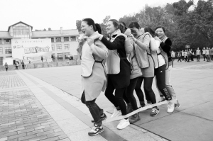 3月7日,在四川省内江市东兴区,女职工们参加“齐心协力”趣味项目的比拼。