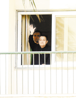 上图:这张2015年5月4日拍摄的资料照片显示,在埃及首都开罗,埃及前总统穆巴拉克向其支持者挥手致意。 新华社发