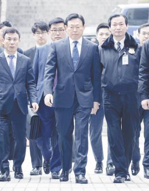 3月20日,乐天集团会长辛东彬(中)到达韩国首尔中央地方法院,准备出席庭审。