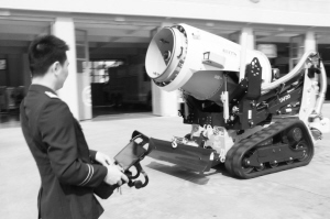 多功能消防灭火机器人亮相厦门 3月21日,福建省厦门市消防支队特勤大队队员在演示操作多功能消防灭火机器人。日前,一台多功能消防灭火机器人在厦门消防支队特勤大队正式投入使用。该款机器人可无线遥控操作,具有灭火、排烟、探测、破拆、摄像等功能,可应用于石油化工、机场、隧道等各种类型火灾处置。新华社发