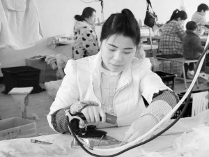 近年来,沈丘县积极拓展留守妇女就业渠道,采取“公司+基地+农户”的经营模式,发展带动当地贫困户参与家庭手工业生产,解决农村劳动力尤其是农村妇女的就业问题,加快当地脱贫步伐。图为周营乡周营村村民正在加工点加工服装。 谢辛凌 摄