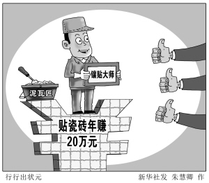 最近,媒体报道湖北一名80后从农民工泥瓦匠变身“镶贴大师”,年收入可达20万元,引起一些网友感叹“自己被碾压”,更引来不少网友的艳羡。事实上,以劳动谋生存,以技术拿高薪,这正体现了市场的法则,以及社会对劳动价值的尊重。新华社发