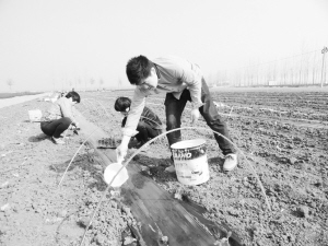 上图:3月30日,商水县舒庄乡杨集村瓜农正在栽植西瓜苗。杨集村是国家级贫困村,该村是县司法局挂点帮扶村,今年该村群众在县司法局的帮助下种植西瓜200多亩。 乔连军 摄