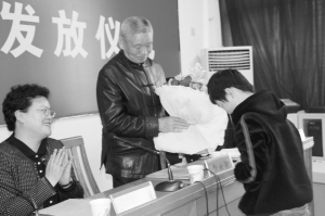 本报讯 大爱无言化春雨,润出桃花一片红。近日,上海阳光励志奖学金发放仪式在扶沟高中举行。这是上海阳光公益基金会李永利先生第四次来到扶沟高中,他将21万元奖学金发放到90名学生手中。县长张颖波、副县长崔卫华等出席发放仪式。张颖波向李永利先生颁发了“捐资助学模范”荣誉证书。