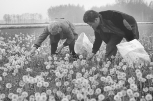 近年来,鹿邑县杨湖口镇推广“企业+扶贫产业基地+贫困户”的模式,把蒲公英种植和产业扶贫紧密结合起来,不断扩大种植规模,先后吸纳众友、浩鑫、致亿、丰禾、豪佳等中药材专业种植合作社,成立河南广进源中药材有限公司,开展中药材种植、收购、加工等业务,带领贫困户脱贫致富。图为两名村民在广进源中药材种植产业扶贫基地采摘蒲公英种子。