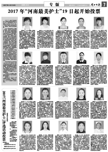 4月17日,经过“河南最美护士”评选活动组委会的策划、初评,2017“河南最美护士”20名候选人正式产生。4月19日起,广大群众可通过平面媒体或大河网、映象网、医药卫生网进行投票。