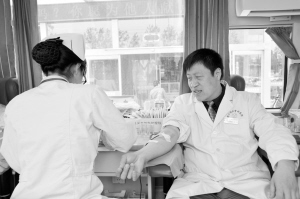 4月22日,周口协和骨科医院在医院门口组织职工进行无偿献血活动。在此次活动中,广大职工积极响应,踊跃报名参与。短短一天时间,该院共献出28800ml健康血液。图为副院长李军带头献血。